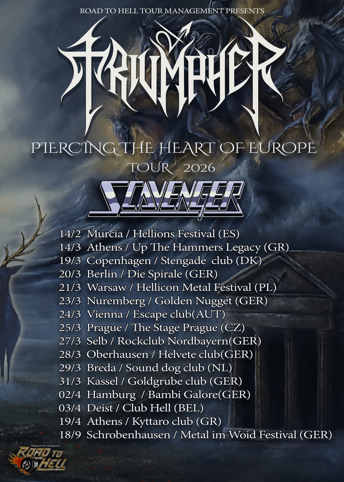 TRIUMPHER has performed at key underground and established metal festivals across Europe, including Keep It True, Up The Hammers, Hell Over Hammaburg, Midálidare Rock Festival, Pyrenean Metal Warriors, Metal im Void, Metalheads Open Air, and Rethymno Rocks. They have also supported major acts such as Crimson Glory, Tom Gabriel Warrior's Triumph of Death, Primordial, Grave Digger, and Midnight. Renowned for their intense, TRIUMPHER delivering fully electric and dominant live performances.